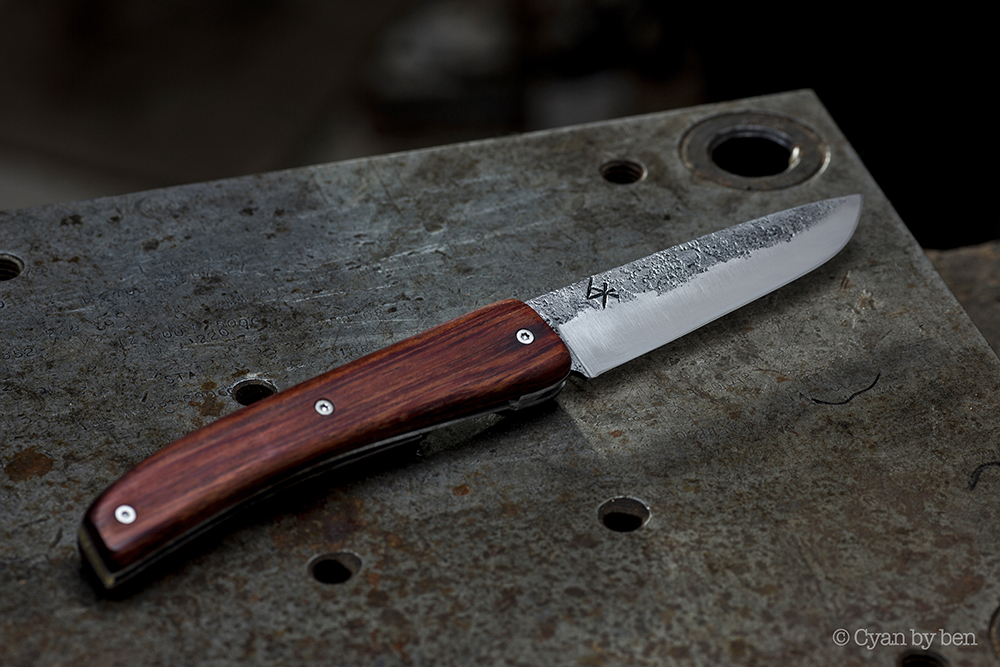 Artisan métallier depuis 2004, c’est la forge qui m’attire et le couteau devient vite un exercice régulier jusqu’à devenir aujourd’hui mon activité principale.