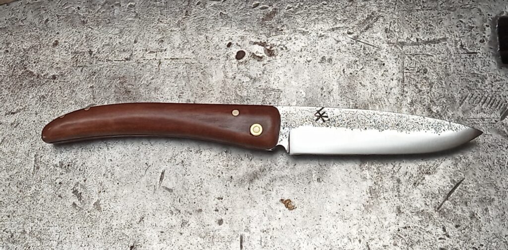 Pliant Liner Lock lame damas « maison » XC75/15n20. Tranchant 8,5 cm. Manche branche d’olivier échauffé.